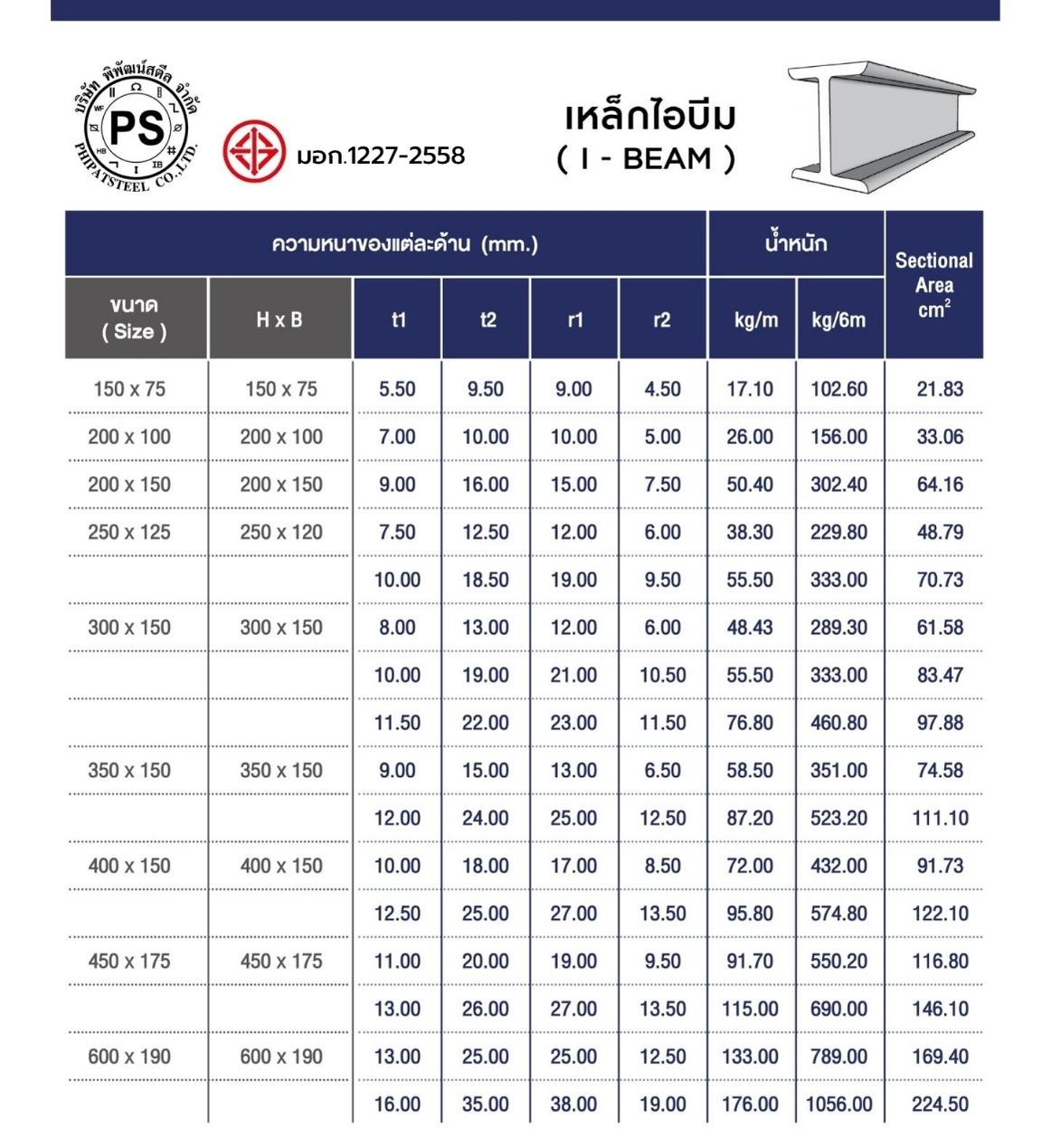 | ขนาด (size) | H x B | t1 | t2 | r1 | r2 | kg/m | kg/6m | |